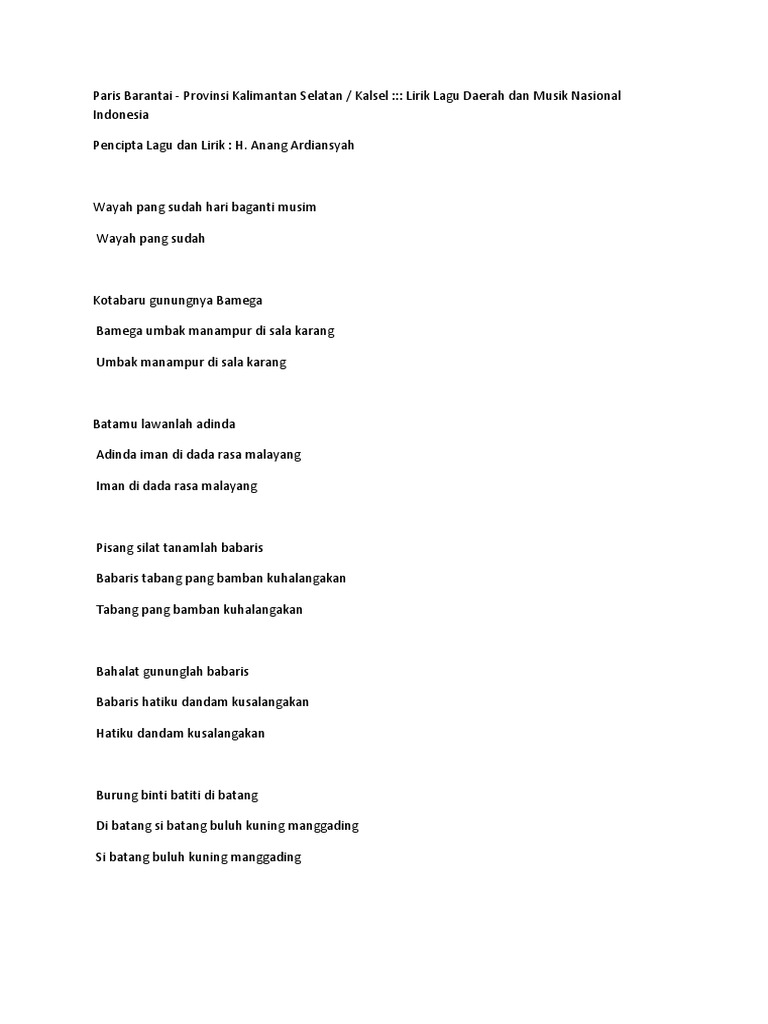 Lagu daerah pada umumnya mengandung nilai nilai kehidupan dan unsur unsur kebersamaan serta menceritakan tentang keadaan lingkungan. Aceh no nama lagu. Lirik lagu paris barantai kalimantan selatan arti dan makna by kisah nusantara october 12 2016 lagu daerah kalimantan selatan informasi lirik arti makna dan sejarah lagu paris barantai salah satu lagu daerah yang berasal dari provinsi kalimantan selatan. Paris barantai adalah lagu berasal dari kalimantan selatan karangan seorang tentara yang lama tinggal di kabupaten kota baru kalimantan selatan.