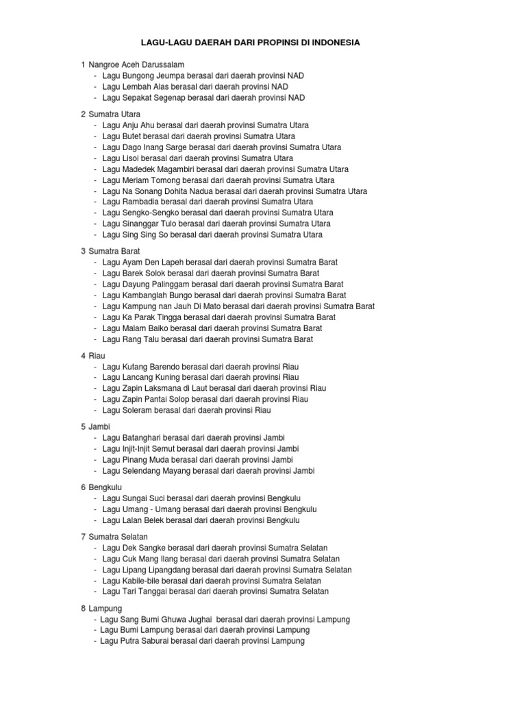 Beberapa dari lagu lagu tersebut seperti di bawah ini. Lagu daerah sendiri merupakan lagu yang berasal dari suatu daerah tertentu serta menjadi ciri dan warisan budaya daerah tersebut. Seperti yang sudah disinggung di pembahasan sebelumnya bahwa lagu daerah indonesia sangat banyak. Kumpulan lagu lagu daerah indonesia lagu daerah merupakan lagu yang berasal dari suatu daerah tertentu serta menjadi ciri khas dan warisan budaya dari daerah tersebut seperti yang kita ketahui indonesia sangat kaya akan keanekaragaman budaya termasuk seni musik nya dengan berbagai lagu daerah yang ada.