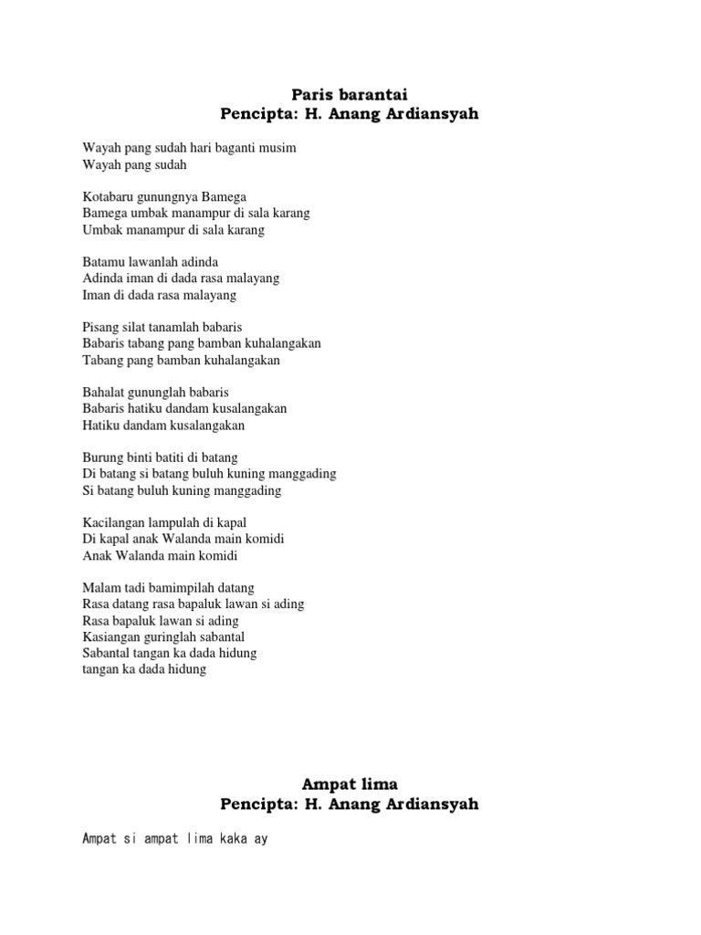 Anang ardiansyah merupakan dua lagu yang menjadi kiblat dalam mencipta lagu daerah banjar. Salah satu karya anang ardiansyah yang paling fenomenal adalah lagu paris barantai. Band atau pencipta lagu bersangkutan. Informasi lagu paris barantai.
